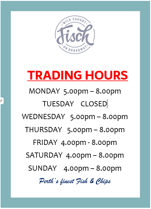 Welcome to Fisch on Broadway the home of our Passion for Fresh, Local and Sustainable seafood. For more than 30 years now we have been gathering, processing and cooking fresh local seafood garnered from our local seafood market or direct from the fisherman. The fishing industry in Western Australia is seasonal but with our large coastline and our vast contacts there is always access to a variety of our fresh local seafood. To maintain the integrity and quality of the freshness and flavour of our local seafood we have always cooked in pure Sunflower oil.