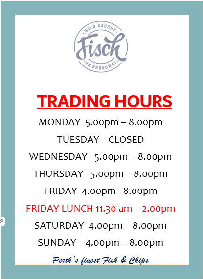 Welcome to Fisch on Broadway the home of our passion for fresh, local and sustainable seafood. For more than 30 years now we have been gathering, processing and cooking fresh local seafood garnered from our local seafood market or direct from the fisherman. The fishing industry in Western Australia is seasonal but with our large coastline and our vast contacts there is always access to a variety of our fresh local seafood. To maintain the integrity and quality of the freshness and flavour of our local seafood we have always cooked in pure sunflower oil.